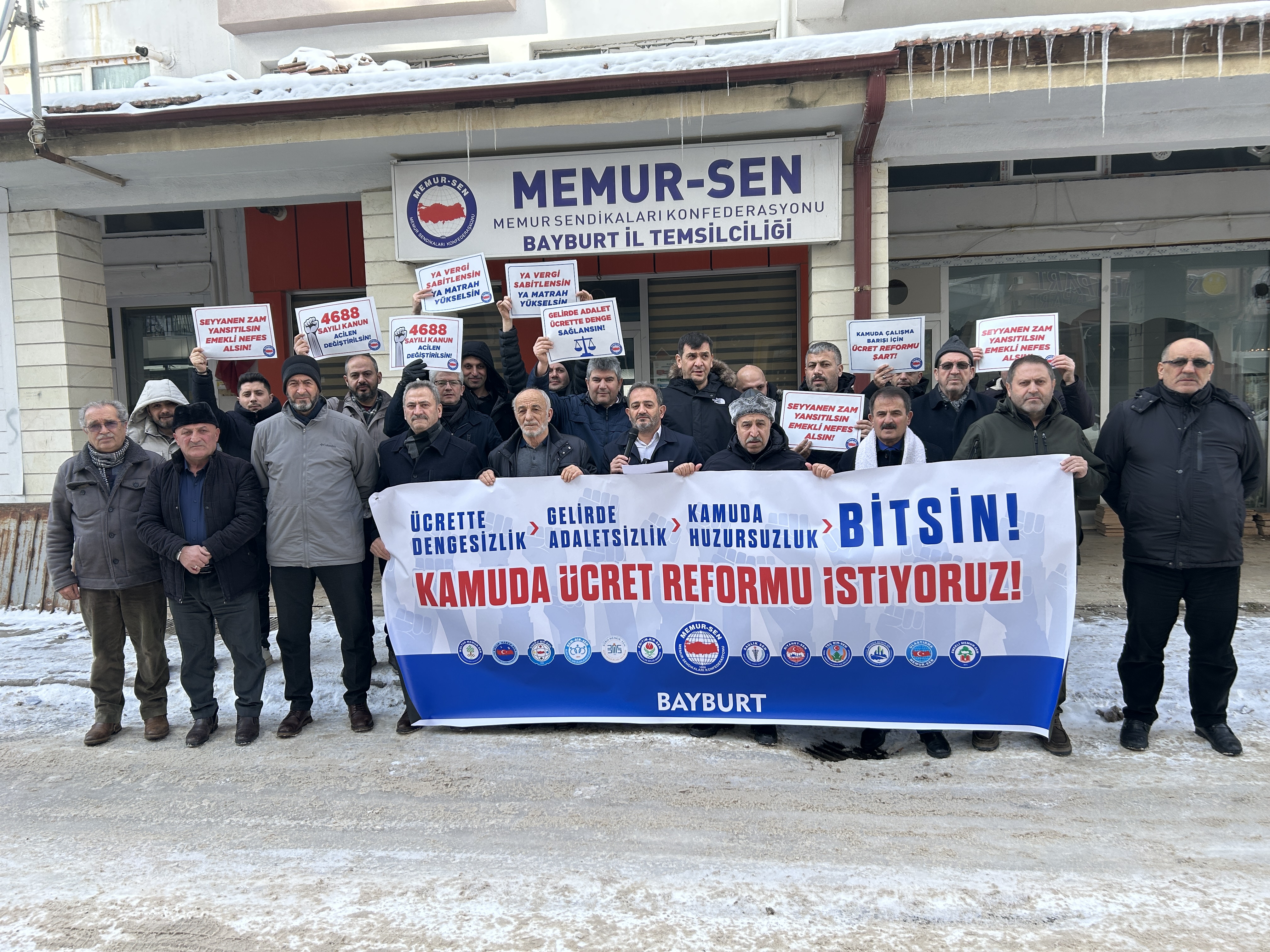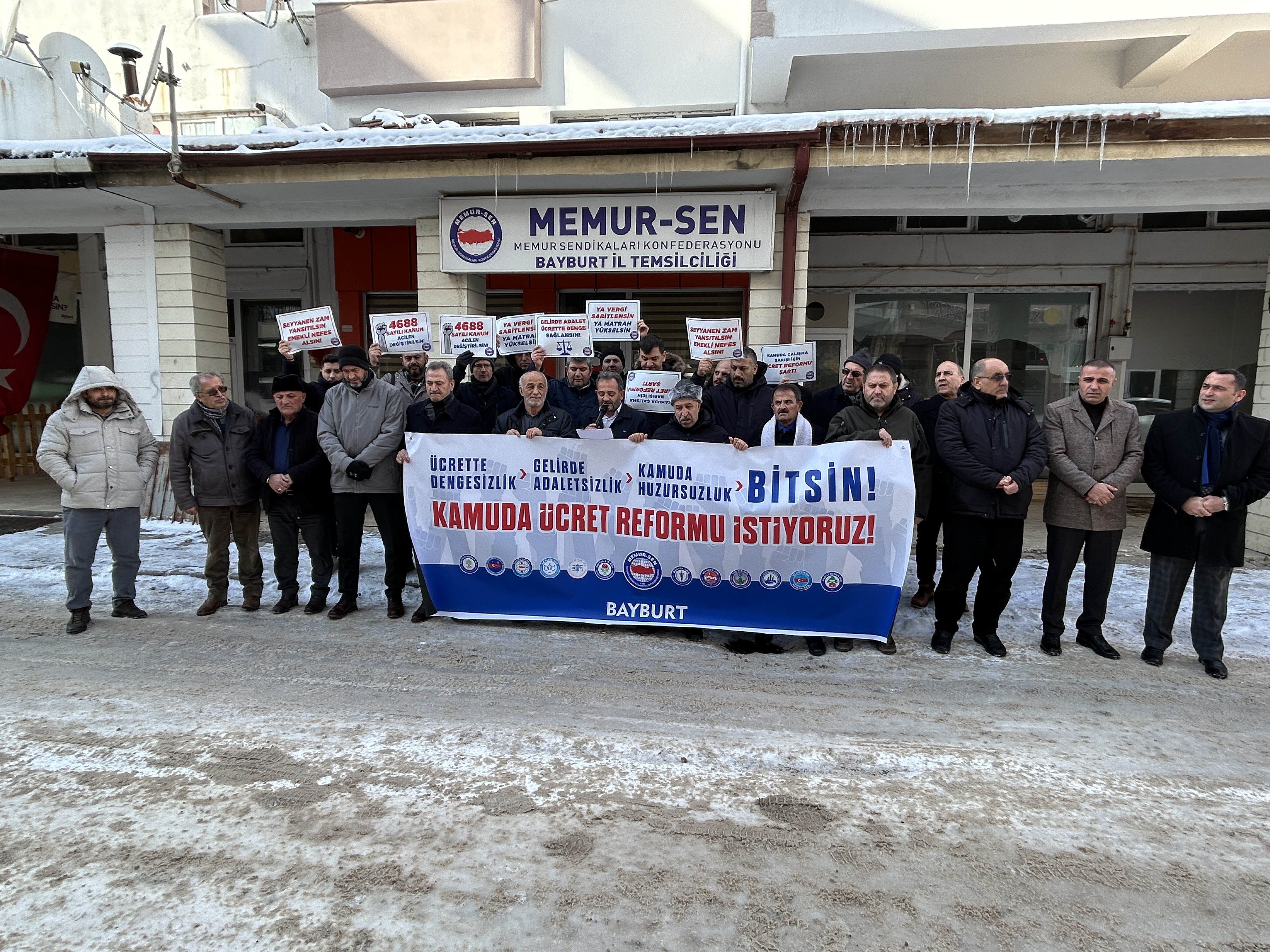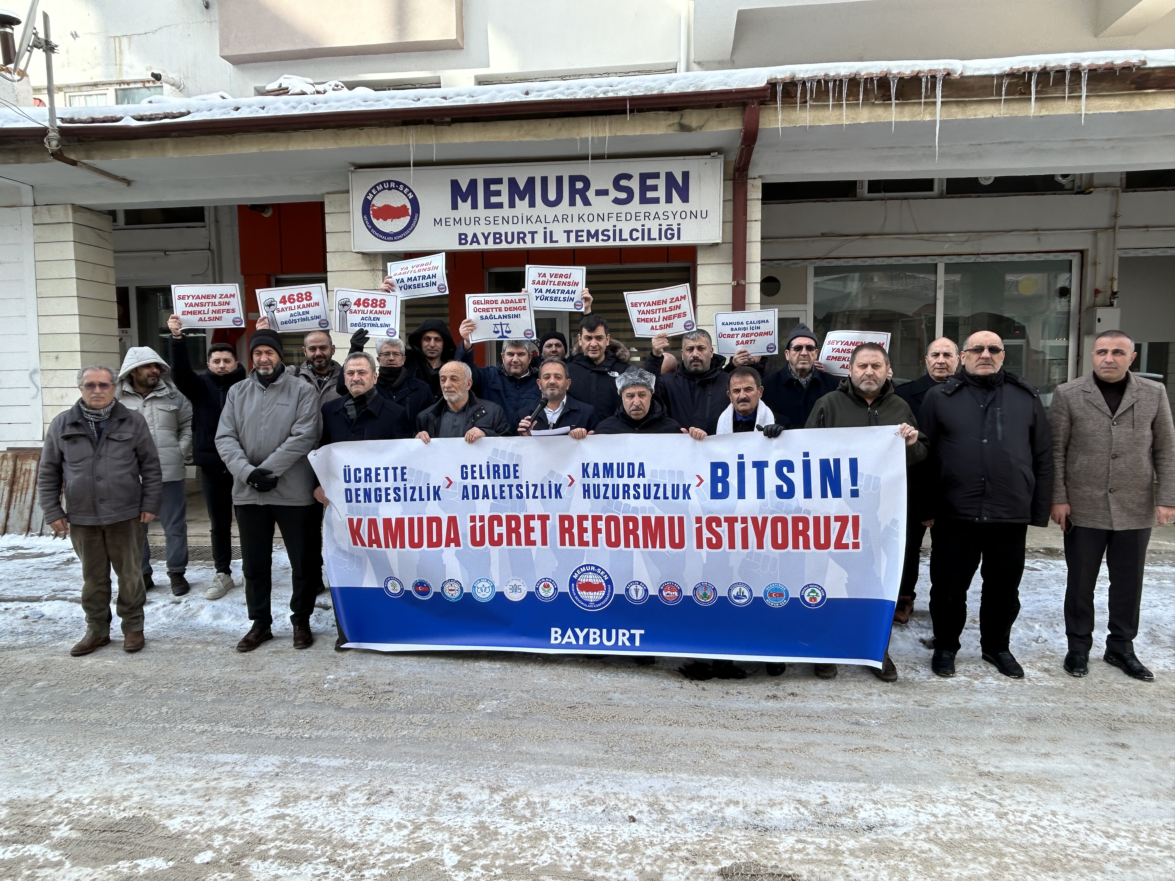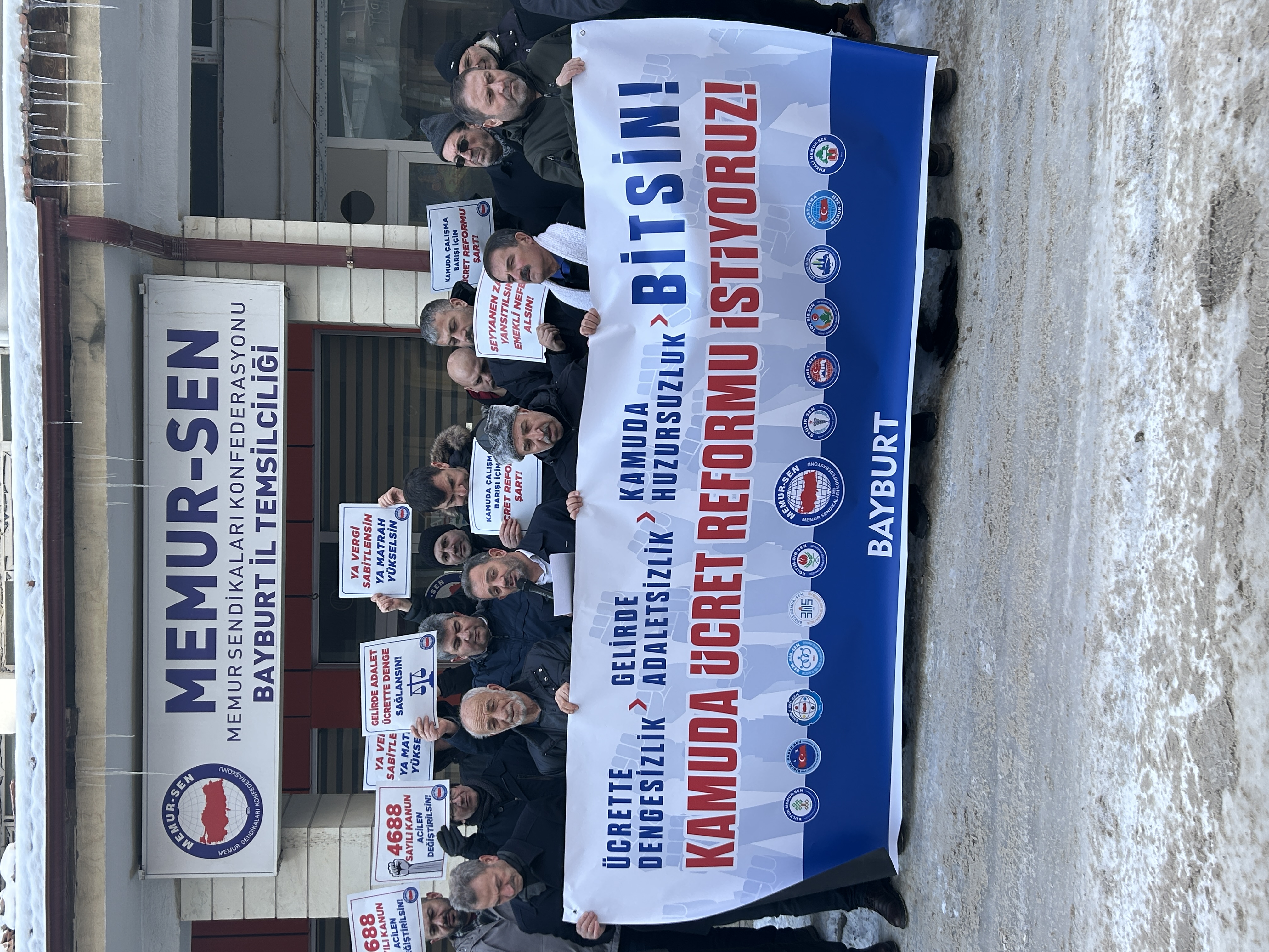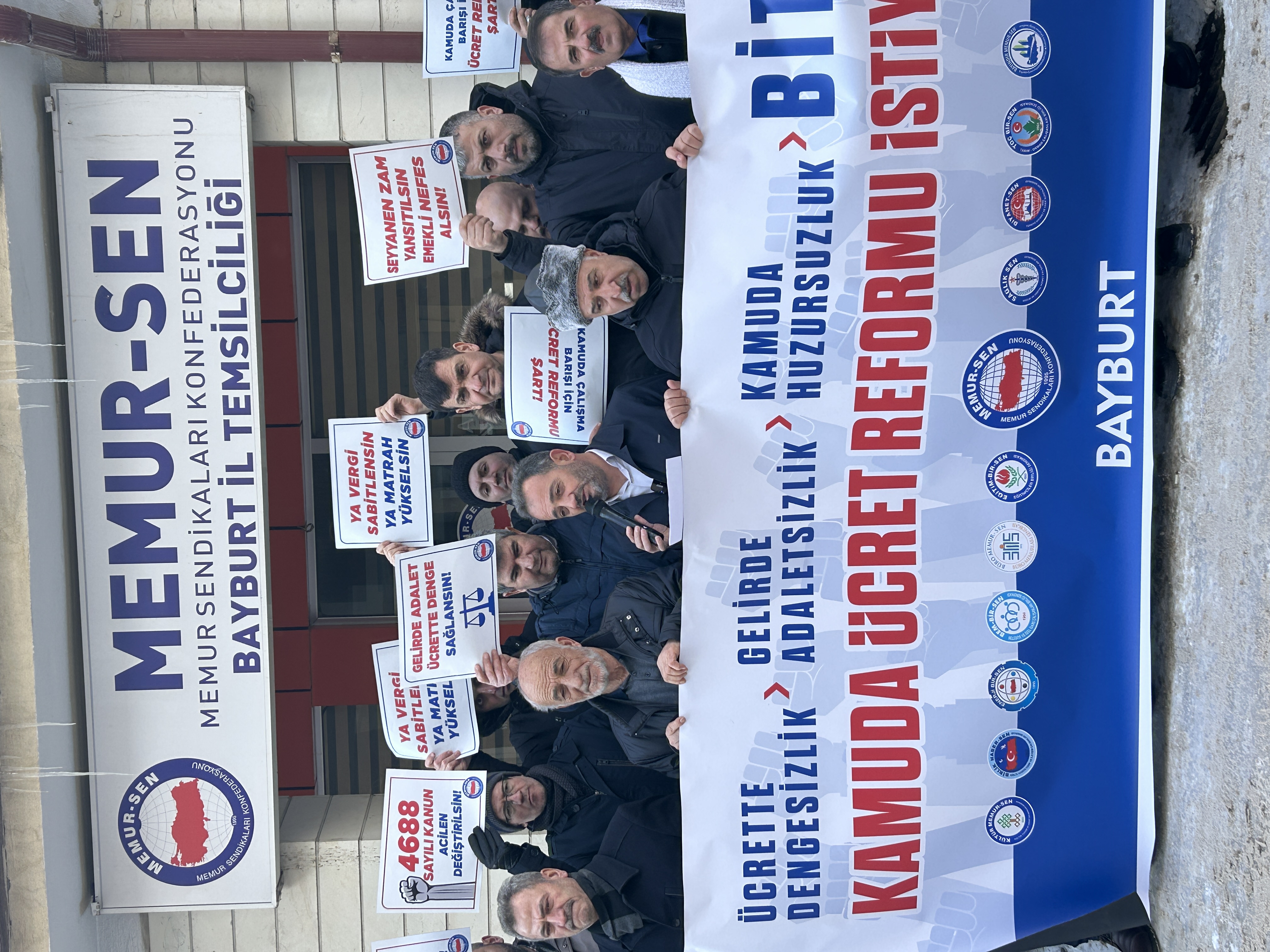 Memur-Sen “Ücrette Dengesizlik, Gelirde Adaletsizlik, Kamuda Huzursuzluk Bitsin” diye Türkiye’nin 81 ilinde meydanlara çıktı. Memur-Sen Bayburt İl Temsilciliği önünde Memur-Sen'e bağlı sendikaların temsilcileri ve üyelerin katılımı ile basın açıklaması gerçekleştirildi.